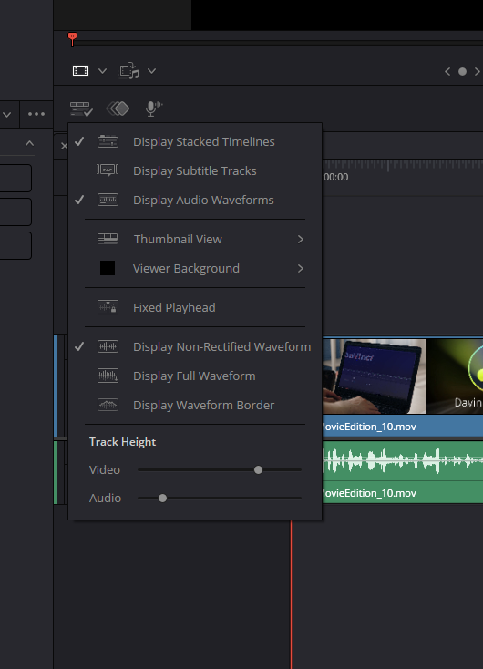 Все основные настройки отображения таймлинии находятся в небольшом меню с иконкой три горизонтальные полоски в левом верхнем углу timeline (рядом с переключателями видео/аудио дорожек).