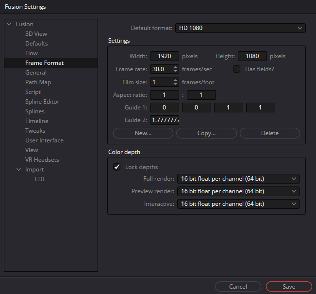 - Frame Format: проверяем разрешение и FPS (обычно совпадает с таймлайном).