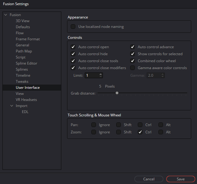 - User Interface → Zoom: снимаем привязку к Ctrl, чтобы масштабировать Flow просто колёсиком.