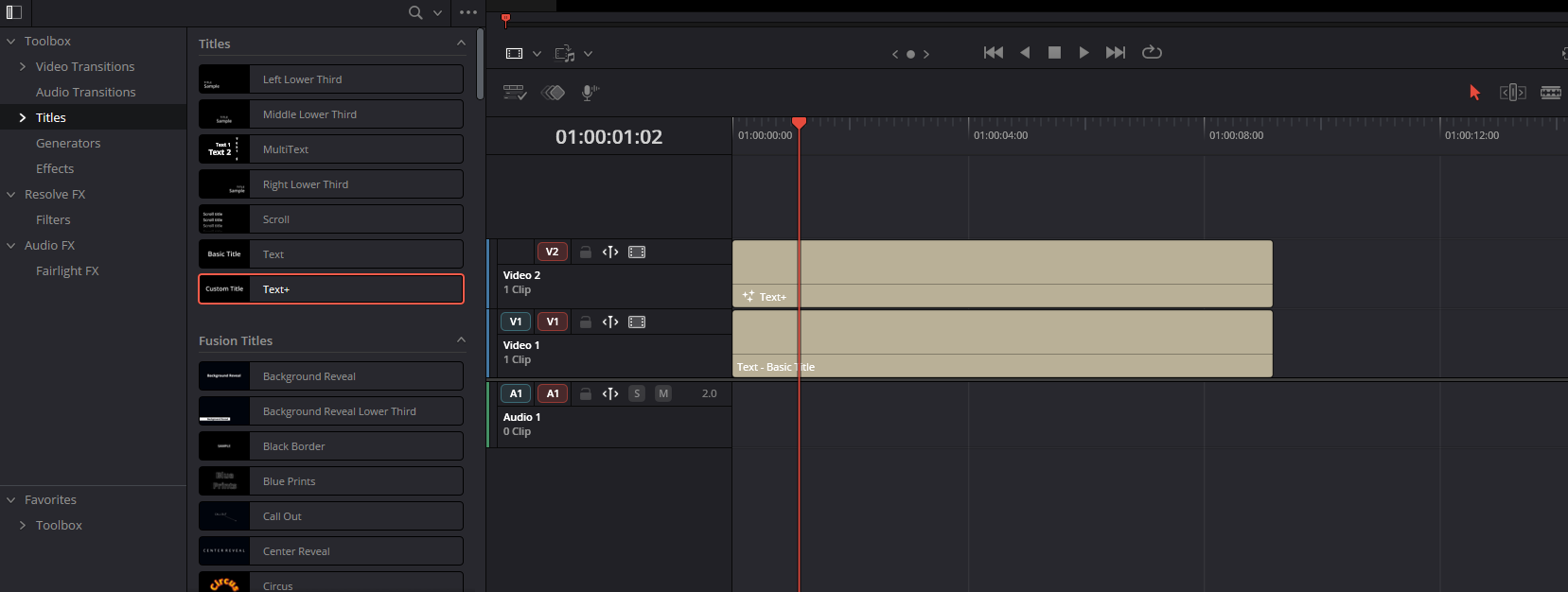 Во вкладке Titles доступны основные текстовые ноды: Text и Text Plus.